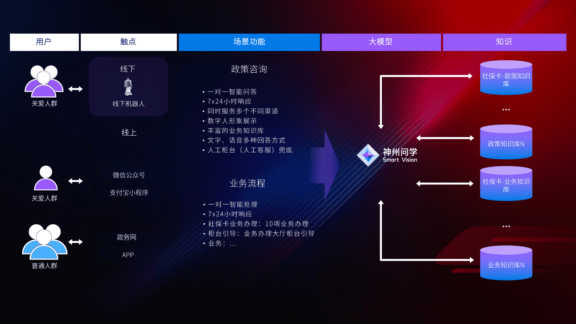 • 线上线下全覆盖:线上提供微信公众号、、、、支付宝小程序、、政务网、、app多种渠道,,,与线下机器人形成完整服务体系。。。。